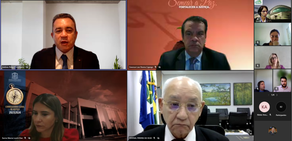 #ParaTodosVerem – Esta matéria possui recursos de texto alternativo para promover a inclusão das pessoas com deficiência visual. Descrição da imagem foto 1 – captura da tela, em destaque no canto superior pela esquerda o juiz Antônio Peleja, ao seu lado o juiz auxiliar Emerson Cajango, abaixo o corregedor, desembargador Juvenal Pereira e a sua esquerda a diretora do Daje, Karine Dias.