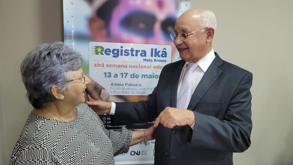 #Paratodosverem. Esta matéria possui recursos de texto alternativo para promover a inclusão das pessoas com deficiência visual. Primeira imagem: corregedor e a chefe de gabinete da prefeitura de Paranatinga, Arlinda Vian, conversam sobre os últimos preparativos. Ao fundo um cartaz da Campanha Registre-se. Na imagem podemos ver ao fundo desfocado um indígena homem, com pintura no rosto e um cocar na cabeça. No primeiro plano está a mão do indígena segurando um cartão com os dizeres “Registra Ikâ Mato Grosso – Xirâ Semana Nacional Oday”, a data da campanha de 13 a 17 de maio, o local de atendimento e outras informações. Há uma moldura que representa pintura a etnia Bakari. Segunda imagem: sala de reunião onde todos os parceiros do Registre-se estão sentados em frente a uma mesa em formato de U. Ao fundo uma TV mostra dados da Semana. Na ponta esquerda da foto, aparecem o corregedor e o juiz auxiliar da CGJ, Eduardo Calmon.