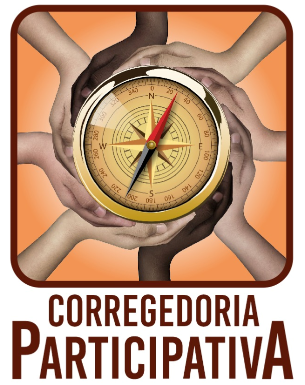 #Paratodosverem. Esta matéria possui recursos de texto alternativo para inclusão das pessoas com deficiência visual. Descrição da imagem: primeira imagem: foto colorida. Logo do Programa Corregedoria Participativa. A imagem tem uma bússola dourada ao centro, rodeada por mãos de diversas etnias.