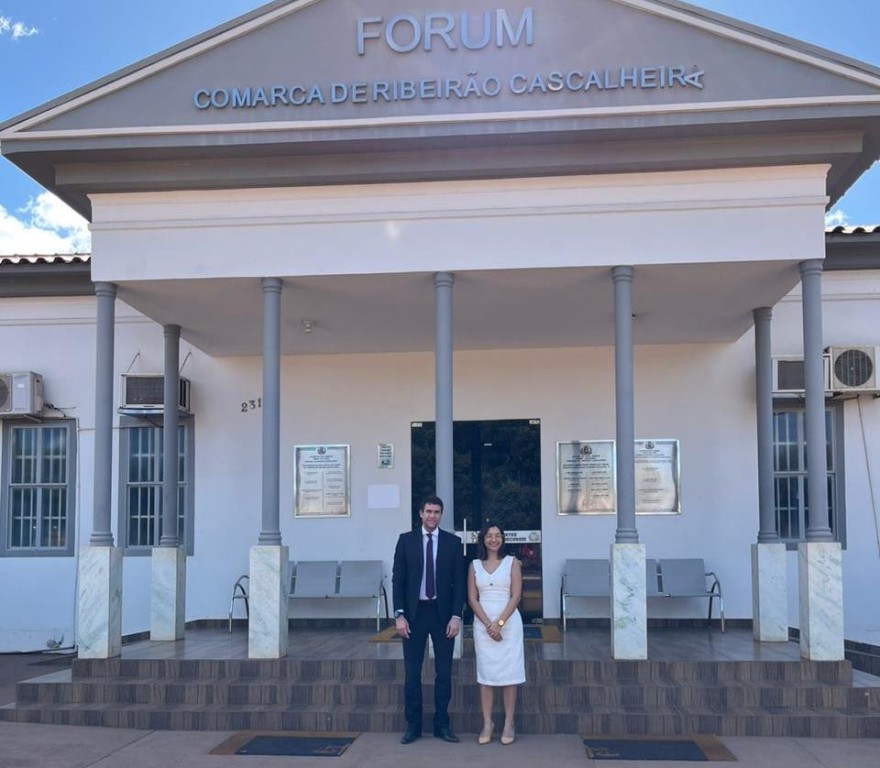 #ParaTodosVerem – Esta matéria possui recursos de texto alternativo para promover a inclusão das pessoas com deficiência visual. Descrição da imagem foto 1 – O juiz auxiliar da CGJ, Eduardo Calmon e a juíza substituta, Raissa da Silva estão em pé em frente ao Fórum de Ribeirão Cascalheira. Descrição da imagem foto 2 – Da direita para esquerda está o juiz auxiliar da CGJ, Eduardo Calmon, a juíza substituta Fernanda Mayumi e o tabelião do 2º Ofício de Itiquira, Wellington. Eles estão em pé em frente à sede do cartório.