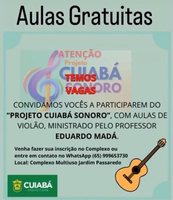 A Prefeitura de Cuiabá, por meio da Secretaria Municipal de Cultura, Esporte e Lazer, está com vagas abertas para o projeto ‘Cuiabá Sonoro’, destinado a pessoas a partir de 10 anos interessadas em aprender a tocar violão. Os cursos são totalmente gratuitos, e as aulas são oferecidas em turmas pela manhã (das 9h às 10h ou das 10h às 11h) e à tarde (das 14h às 15h e das 15h às 16h). Não é necessário possuir o instrumento musical, pois há violões disponíveis no local para uso dos alunos. As atividades são realizadas no Complexo Multiuso do Jardim Passaredo. As aulas são ministradas pelo professor Eduardo Madá.