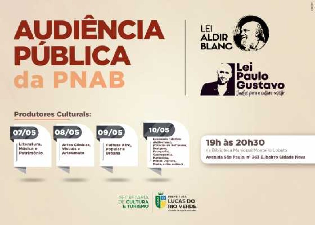 A Secretaria de Cultura e Turismo de Lucas do Rio Verde convida os produtores culturais para participarem da Audiência Pública da PNAB sobre a implantação das Leis Aldir Blanc e Paulo Gustavo no município.