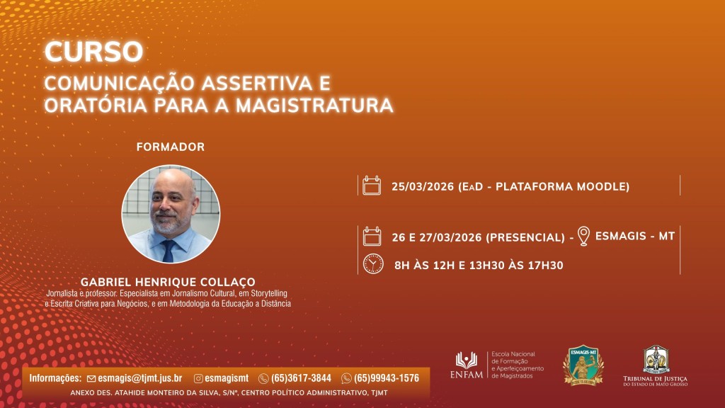 Atenção, assessores, chefes de gabinete e gestores judiciários! Estão abertas as inscrições para o curso ‘Comunicação Assertiva e Oratória para a Magistratura’. O aperfeiçoamento será realizado de 25 a 27 de março e será ministrado pelo jornalista e professor Gabriel Henrique Collaço, profissional com ampla experiência em comunicação e formação de magistrados.