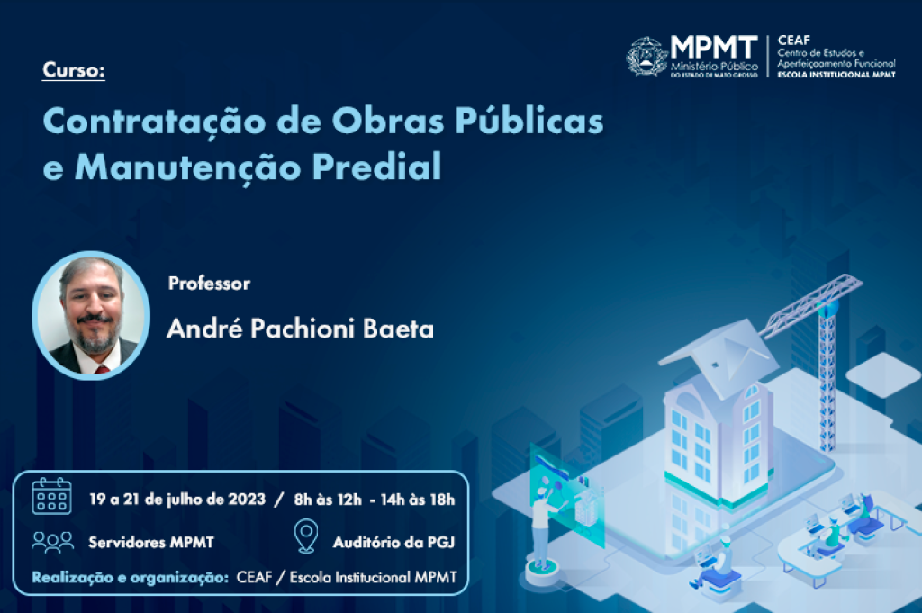 O objetivo é capacitar os servidores que atuam nas áreas de obras públicas e manutenção predial do Ministério Público do Estado de Mato Grosso, para que sejam capazes de gerir e fiscalizar contratos administrativos de execução de obras públicas e manutenção predial, bem como atualizá-los sobre os entendimentos do Tribunal de Contas da União sobre o tema. O instrutor será o engenheiro mecânico André Pachioni Baeta, auditor federal de Controle Externo do Tribunal de Contas da União.