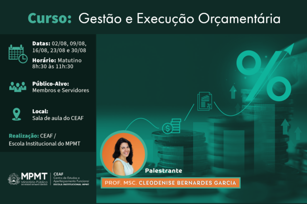 O curso Gestão e Execução Orçamentária, promovido pelo Centro de Estudos e Aperfeiçoamento Funcional (Ceaf) – Escola Institucional do Ministério Público do Estado de Mato Grosso, começa nesta quarta-feira (2). Com carga horária de 20 horas, a ação educacional será desenvolvida presencialmente em cinco encontros no decorrer do mês de agosto, sempre às quartas-feiras, das 8h30 às 11h30, na sala de aula da escola, localizada na sede das Promotorias de Justiça de Cuiabá.