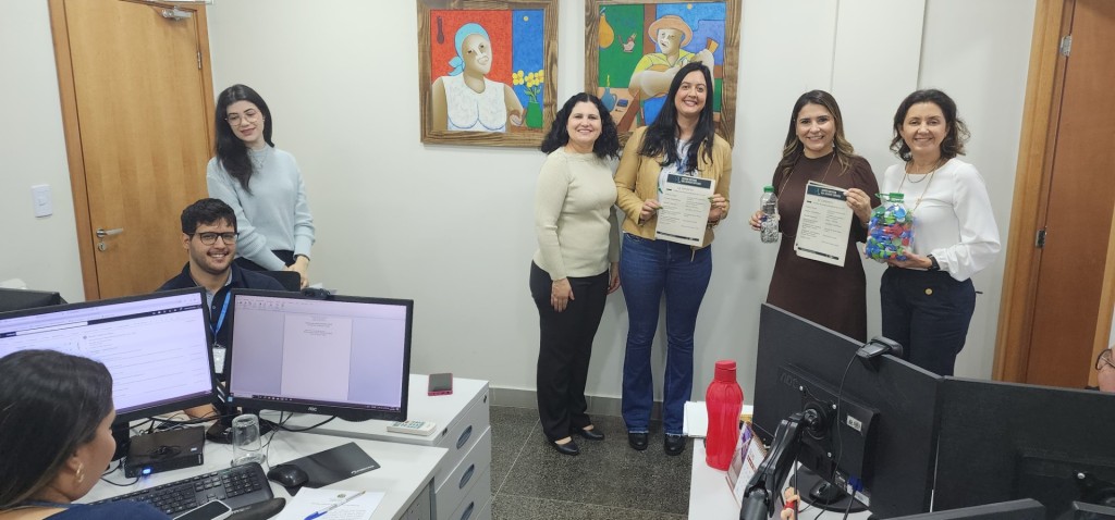 #Paratodosverem – Esta matéria possui recursos de texto alternativo para promover a inclusão das pessoas com deficiência visual. Foto 1 – Descrição das imagens: A sala direita a juíza auxiliar Christiane da Costa Marques Neves segura uma garrafa de plástico contendo diversas tampinhas de plástico para reciclagem, ao seu lado está a diretora do Daje, Karine Dias, a assessora de sustentabilidade, Elaine Alonso e a secretária geral da Ceja, Elaine Zorgetti, além de demais servidores do gabinete.