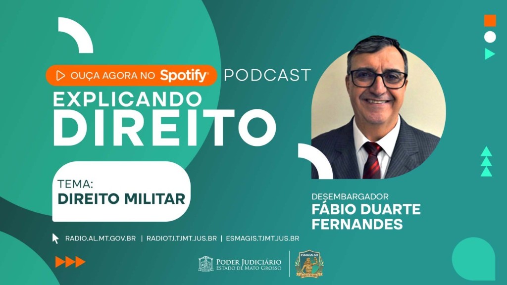 #ParaTodosVerem – Esta matéria possui recursos de texto alternativo para promover a inclusão das pessoas com deficiência visual. Descrição: peça publicitária retangular e colorida. Na lateral esquerda, o texto ‘Ouça agora no Spotify!’, seguido da palavra Podcast. No centro, o nome do programa Explicando Direito, com foto e nome do convidado, Desembargador Fábio Duarte Fernandes, bem como o tema Direito Militar. Na parte inferior, os endereços eletrônicos da Rádio Assembleia, Rádio TJ e Escola da Magistratura. Assina a peça o logo do Poder Judiciário de Mato Grosso e da Esmagis-MT.