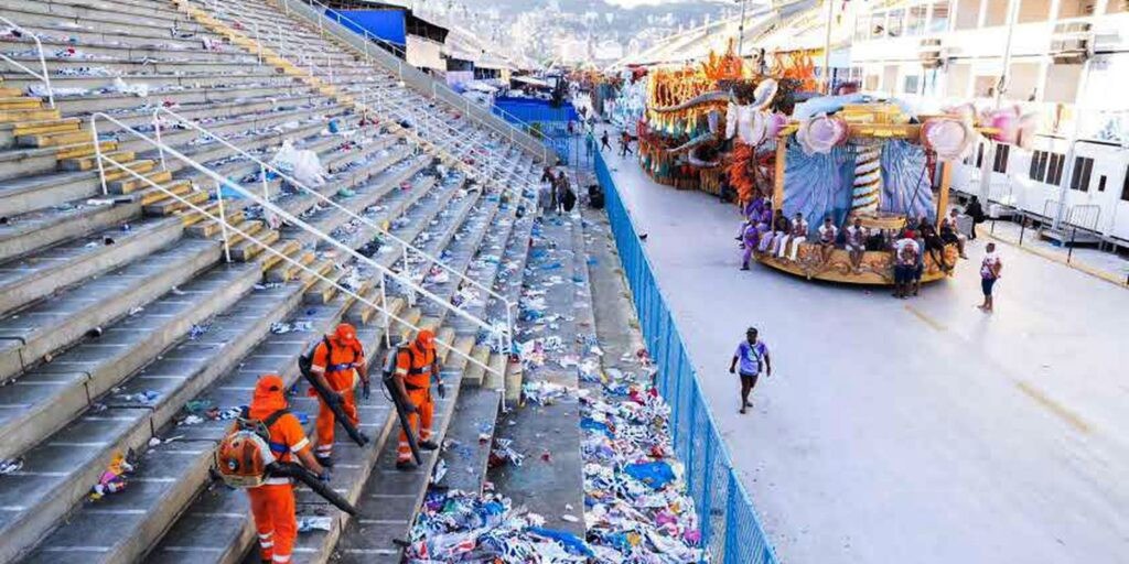 O último dia de desfiles das escolas de samba do Grupo Especial do Rio de Janeiro, no Sambódromo da Marquês de Sapucaí, resultou em 76,5 toneladas de lixo, recolhidas pelas equipes da Companhia Municipal de Limpeza Urbana do Rio (Comlurb). Somente na área interna da Passarela do Samba foram 55,5 toneladas. Desse volume, 49,8 toneladas eram de orgânicos e 5,7 toneladas de materiais potencialmente recicláveis. Já na área externa, as equipes recolheram 21 toneladas de resíduos.