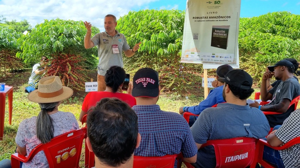 Da segunda a quarta estação, a equipe da Embrapa apresentou sobre a implantação da lavoura: tratos culturais e manejo nutricional com João Maria Diocleciano; manejo integrado de pragas e doenças, com José Nilton Medeiros Costa; e na última estação com Marcelo Curitiba Espíndula, que mostrou o desempenho agronômico dos Robustas Amazônicos no cerrado mato-grossense.