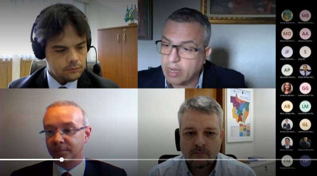 #ParaTodosVerem – Esta matéria possui recursos de texto alternativo para promover a inclusão das pessoas com deficiência visual. Print de tela onde aparecem quatro participantes do encontro. São eles: o promotor Aluísio Maciel Neto, um homem branco de cabelos castanhos que usa um fone de ouvido com microfone; ao lado dele o desembargador Marcos Machado, um homem branco de óculos de grau e cabelos grisalhos; o promotor Newton Teixeira, um home branco, de óculos de grau e cabelos brancos; e o juiz Moacir Tortato, um home branco, de cabelos grisalhos e cavanhaque.