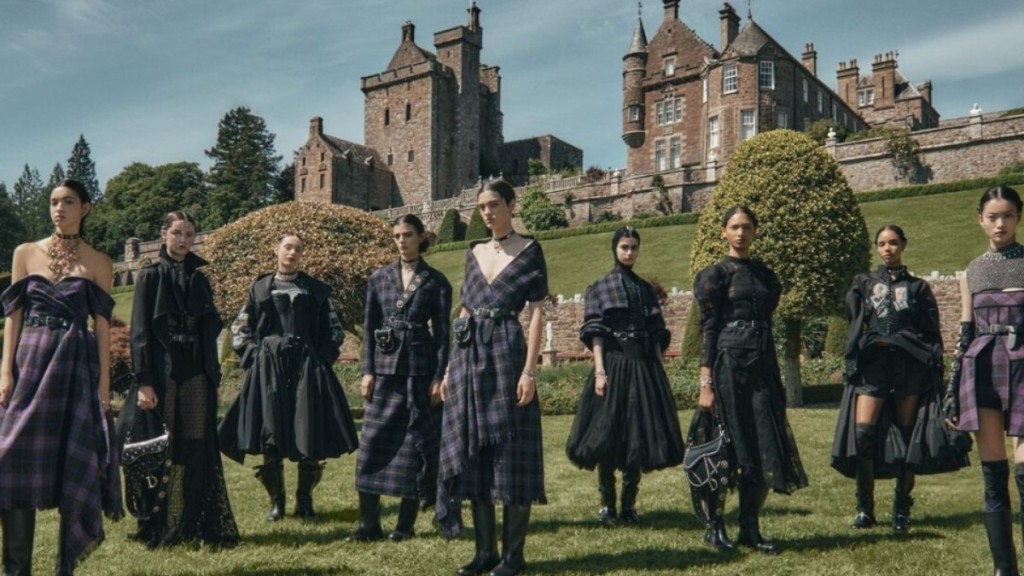 Nessa segunda-feira (3), a Dior apresentou sua coleção cruise 2025 nos jardins do castelo Drummond , em Perthshire, na Escócia. A passarela foi aberta por uma modelo tocando gaita de foles em um vestido volumoso vermelho nesta coleção, o país se tornou a base narrativa.