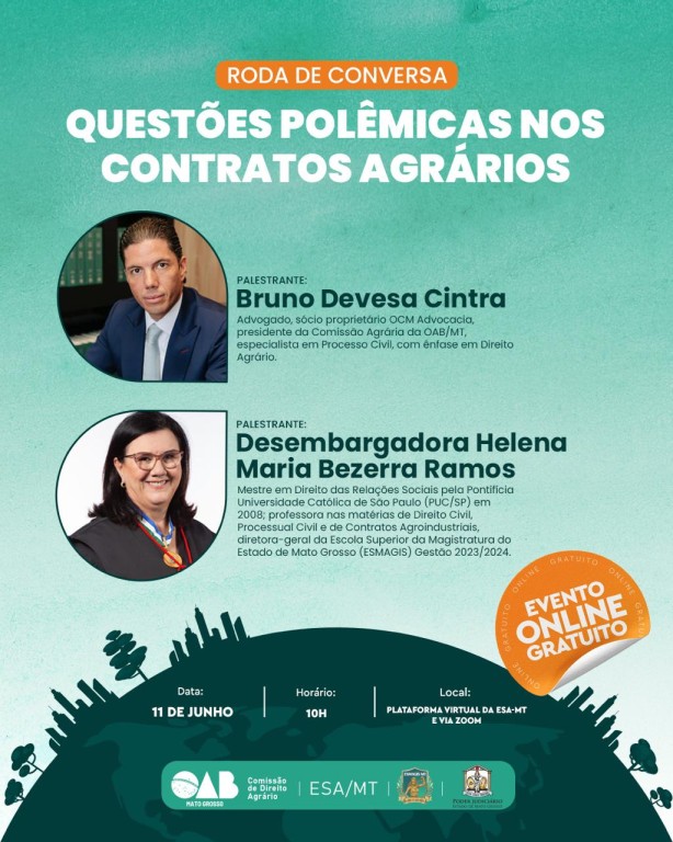 #ParaTodosVerem – Esta matéria possui recursos de texto alternativo para promover a inclusão das pessoas com deficiência visual. Imagem 1: Arte publicitária colorida em tons de verde claro, onde aparece o tema a ser abordado em destaque – Questões polêmicas nos contratos agrários. Logo abaixo, a foto dos dois palestrantes, o advogado Bruno Cintra e a desembargadora Helena Maria. Ele é um homem branco, de cabelos escuros, que usa roupa social azul. Ela é uma mulher branca, de cabelos escuros, que veste toga e usa óculos de grau. Abaixo a data (11 de junho), horário (10h) e local (plataforma virtual da ESA e via Zoom). Assinam a peça o logo da Comissão de Direito Agrário da OAB, ESA, Esmagis-MT e Poder Judiciário.