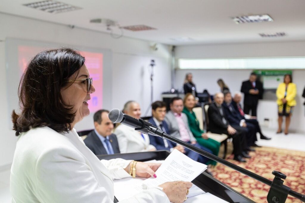 Esta matéria possui recursos de texto alternativo para promover a inclusão das pessoas com deficiência visual. Descrição das imagens: Foto1 – imagem retangular colorida. Imagem retangular colorida. Mulher de cabelos pretos curtos fala ao púlpito para plateia e para dispositivo de honra. Foto2 – imagem retangular colorida. Mulher de cabelos loiros, veste roupa verde e fala ao microfone para dois homens e duas mulheres à frente dela. Atrás, pessoas estão sentadas em cadeira. Foto3 – imagem retangular colorida. Três pessoas em pé. Ao centro mulher de cabelo loiro, usa roupa verde. À Direita mulher de cabelo curto usa roupa branca e segura folha de papel. À esquerda homem usa terno azul escuro e segura papel. Todos olham para a foto e todos sorriem.