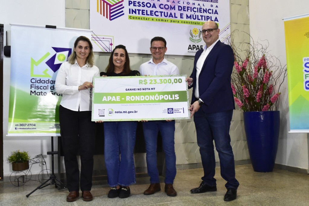 A entrega do cheque simbólico foi acompanhada também por funcionários da Apae de Rondonópolis, representantes das entidades sociais da região, além da equipe que coordena o Nota MT e servidores da Setasc.