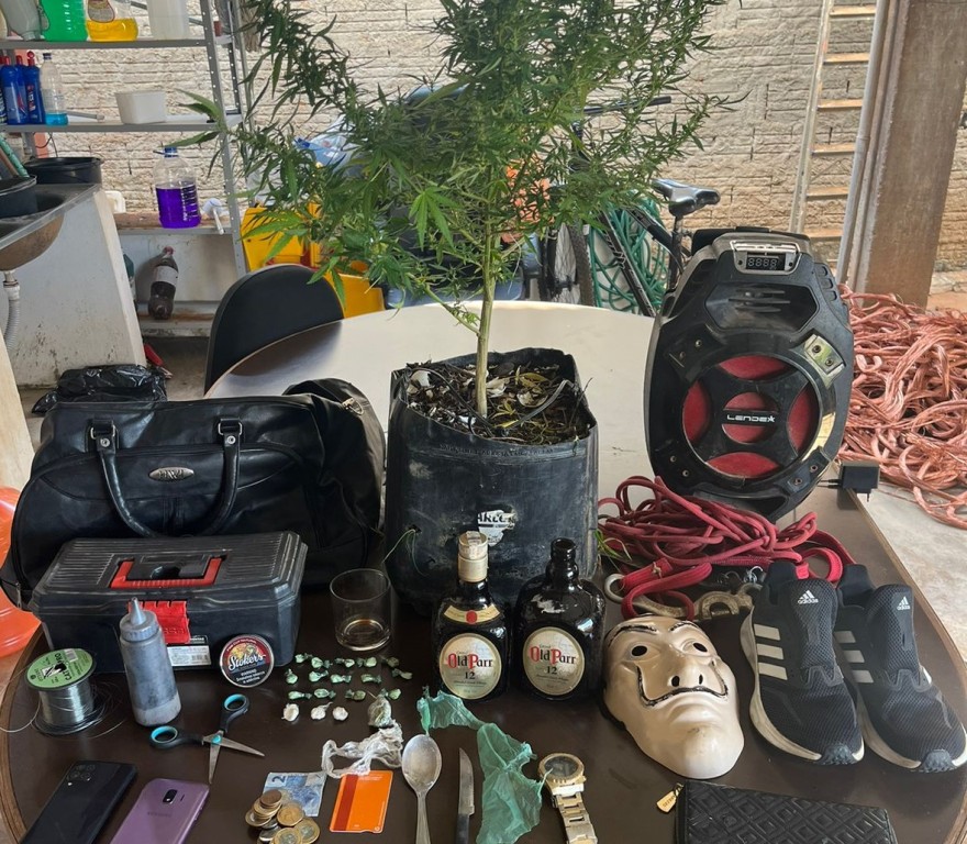 No local foram encontradas 17 trouxinhas de maconha e porções de pasta base, uma porção grande de maconha, a planta de maconha, além de dinheiro trocado e insumos para empacotar a droga.