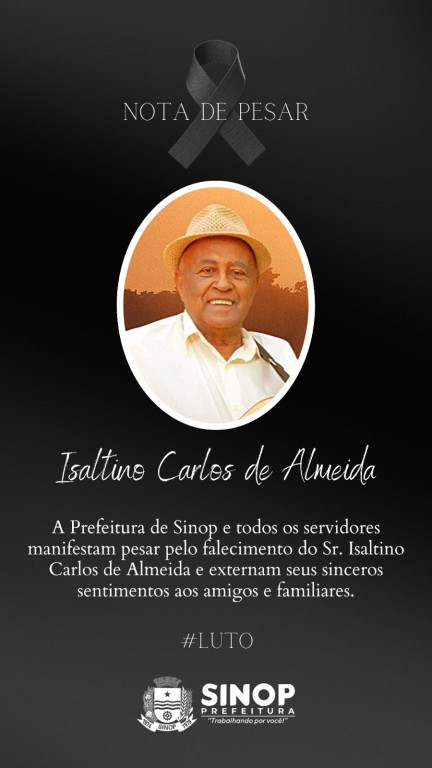 O prefeito Roberto Dorner decretou nesta sexta-feira (5), luto oficial por três dias (Decreto 134/2023) no município, em virtude da morte do pioneiro de Sinop, Isaltino Carlos de Almeida. Sr. Isaltino pertencia ao rol das famílias pioneiras, co-fundadoras do município e residia em Sinop desde o ano de 1982. Ele deixa um legado de pioneirismo no município e de trabalho em prol de entidades e da cultura.
