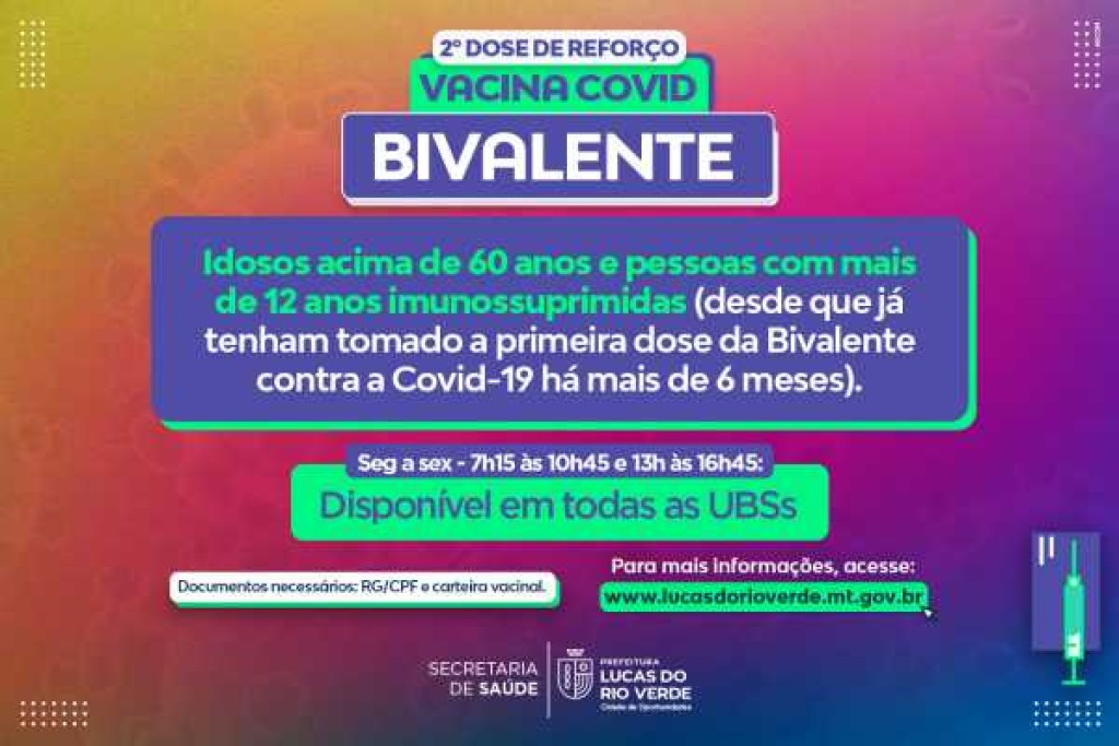 A Secretaria de Saúde de Lucas do Rio Verde informa que, por conta da orientação do Ministério da Saúde através da Nota Técnica nº 83/2023-CGVDI/DPNI/SVSA/MS, está disponível em todas as Unidades Básicas de Saúde (UBSs) a segunda dose de reforço da vacina Bivalente contra a Covid-19. O público-alvo são os idosos e pessoas com comorbidade com mais de 12 anos que já tenha tomado a última dose do imunizante há mais de seis meses.