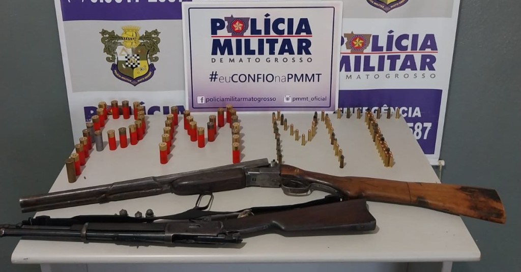 Dois homens, de 51 e 20 anos, foram presos em flagrante pela Polícia Militar por porte ilegal de arma de fogo na manhã desta terça-feira (30.04), em Guiratinga. Na ação, foram apreendidas duas espingardas e 105 munições para o armamento.