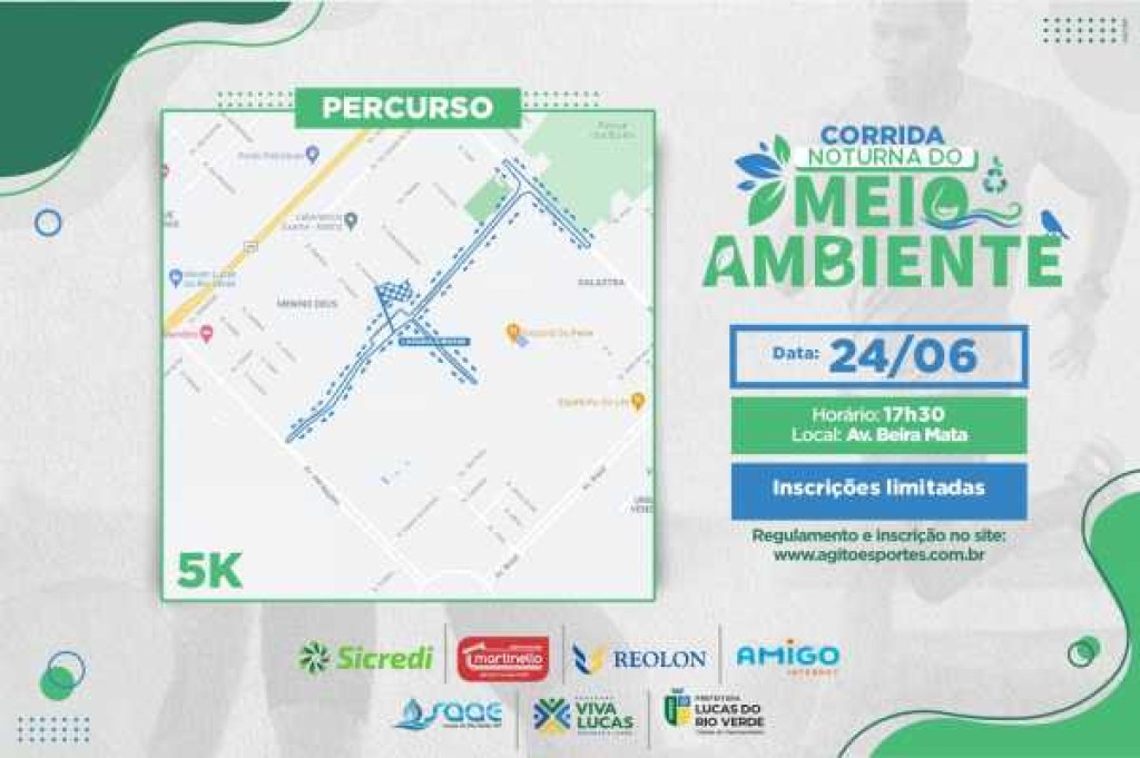 Neste sábado (24), a partir das 17h30, será realizada a Corrida Noturna do Meio Ambiente. O evento faz parte da programação da Semana do Meio Ambiente, realizado pela Secretaria de Agricultura e Meio Ambiente em parceria com a secretaria de Esporte e Lazer.