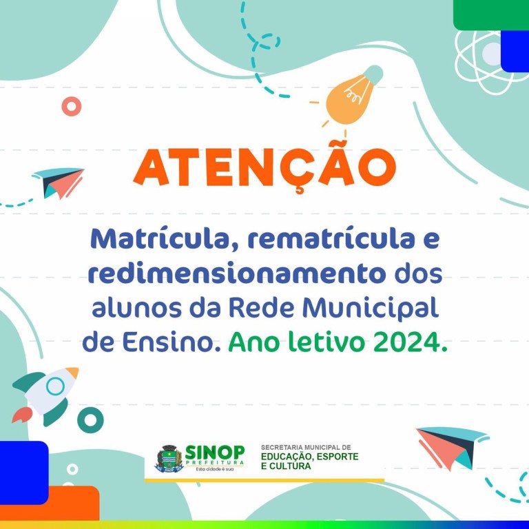 A Secretaria de Educação, Esporte e Cultura, informa os pais que devem ficar atentos ao período de matrícula, rematrícula e redimensionamento dos alunos da Rede Municipal de Ensino, para o Ano Letivo de 2024. O cronograma organizado pela secretaria, iniciou agora neste mês de outubro e segue até o começo de março do ano que vem, dividindo os procedimentos em várias etapas, conforme horário de atendimento das unidades escolares.