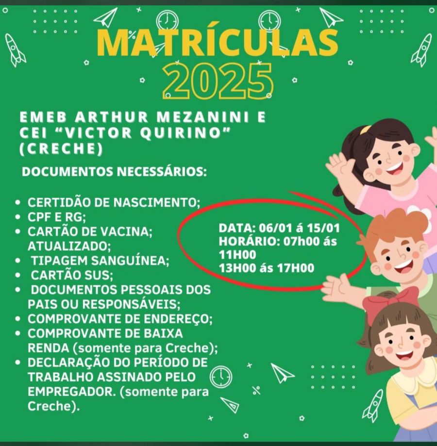 As matrículas são para a Escola Municipal Arthur Mezanini e o Centro Educacional Victor Quirino (creche). Para a creche, também é necessária a apresentação de comprovante de baixa renda e declaração do período de trabalho assinada pelo empregador.