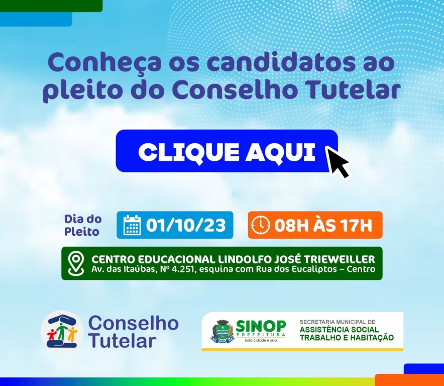 O pleito eleitoral para eleição de novos conselheiros tutelares de Sinop está chegando. A votação será no próximo domingo, dia 1º de outubro, das 8h às 17h, no Centro Educacional Lindolfo josé Trieweiller, localizado na Avenida das Itaúbas, 4.251 (esquina com Rua dos Eucaliptos) – Centro. Para votar, a população precisa levar documento com foto e título de eleitor atualizado, lotado no município.