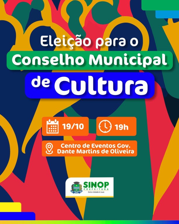 A Prefeitura de Sinop, por meio da diretoria de Cultura, realiza no dia 19/10 às 19h, no Centro de Eventos Governador Dante de Oliveira, a eleição do Conselho Municipal de Cultura. Serão eleitos 10 conselheiros titulares, entre eles estão 5 membros do poder público, 5 membros da sociedade civil e 10 suplentes, que irão propor políticas públicas para a cultura no município. As inscrições serão feitas no mesmo dia da eleição. Toda a população é convidada a participar.