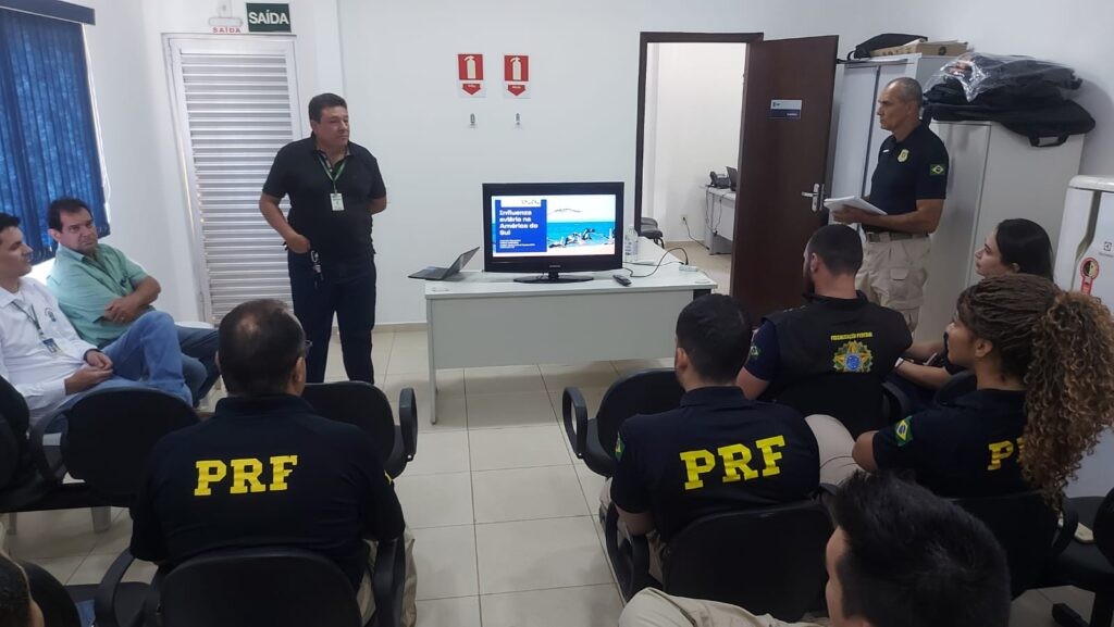 Com apoio do Ministério da Agricultura e Pecuária (MAPA) e Instituto de Defesa Agropecuária do Estado do Mato Grosso (INDEA/MT), a PRF participou de palestra para orientar o efetivo sobre procedimentos, prevenção e identificação de animais com Gripe Aviária na região de fronteira.