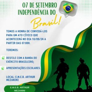 A Prefeitura de Indiavaí, através da Secretaria Municipal de Educação, irá promover Ato cívico, apresentações escolares e desfile com a Banda do Exército Brasileiro.