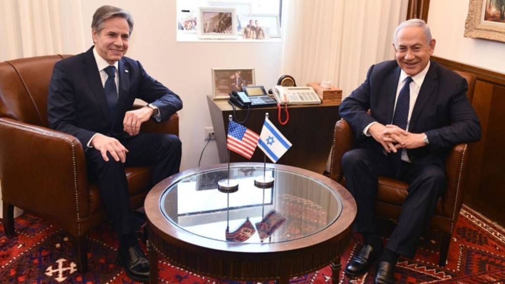 Secretário de Estado dos EUA, Antony Blinken, e primeiro ministro de Israel, Benjamin Netanyahu