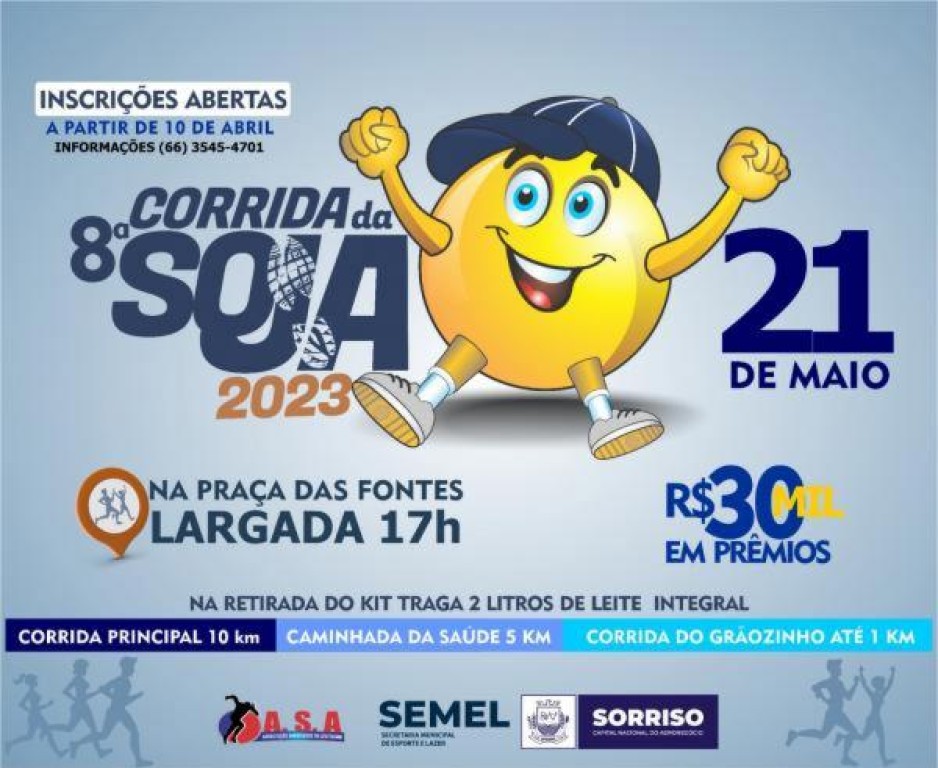 Já tradicional no Município, a Corrida da Soja é promovida pela Administração Municipal de Sorriso, por meio da Secretaria de Esporte e Lazer. Para sua realização, demais secretarias contribuíram, juntamente com a Associação Sorrisense de Atletismo (Asa/Sorriso).