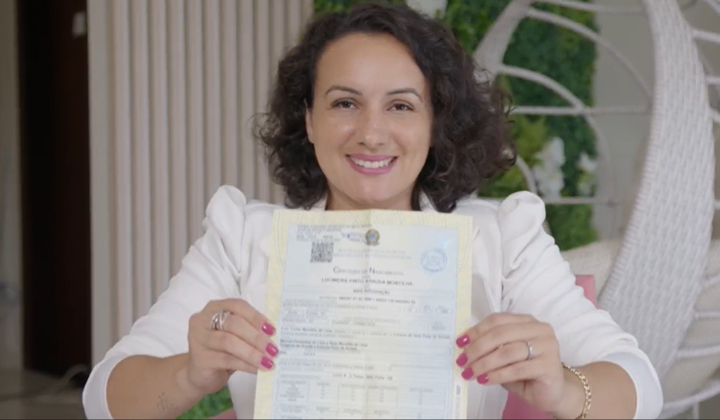 Primeira imagem: fotografia colorida mostrando a empresária. Ela está sentada e exibe a certidão de nascimento.