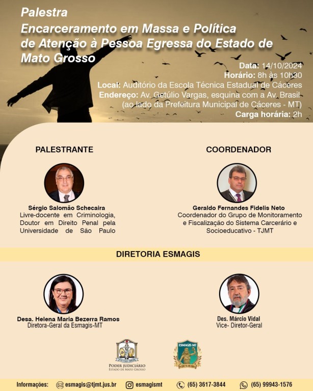 “Encarceramento em massa e Política de Atenção à Pessoa Egressa do Estado de Mato Grosso” é o tema de duas palestras que serão ofertadas pela Escola Superior da Magistratura de Mato Grosso (Esmagis-MT) e Universidade Federal de Mato Grosso (UFMT) no dia 14 de outubro, nas cidades de Cáceres (8h às 10h) e Cuiabá (19h às 21h).