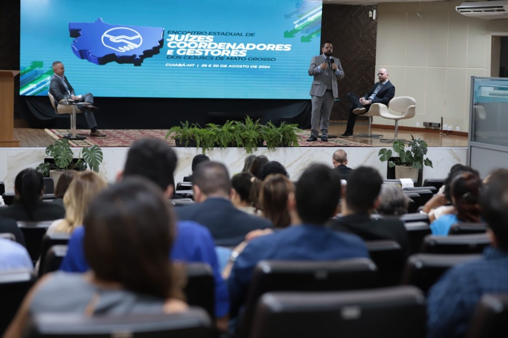 O segundo dia do Encontro Estadual de Juízes, Coordenadores e Gestores dos Cejuscs de Mato Grosso foi marcado pelo painel temático “Indicadores Afetos à Autocomposição de Conflitos”, realizado nesta sexta-feira (30 de agosto) no auditório Gervásio Leite, na sede do Tribunal de Justiça de Mato Grosso (TJMT).