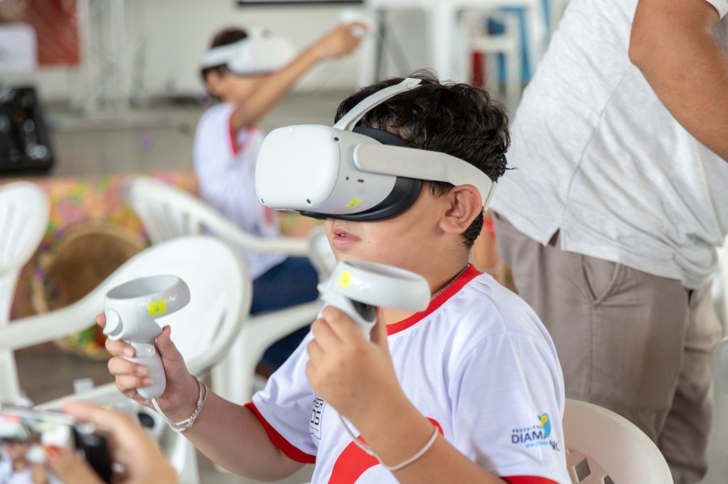 As crianças ainda puderam ter a experiência na prática com os óculos de realidade virtual.
