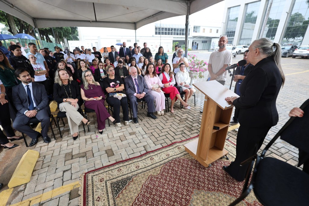 O Gemini disse Sob uma tenda, uma mulher discursa em um púlpito para uma plateia sentada e atenta. O grupo é diversificado, composto por homens e mulheres em trajes formais. O evento ocorre em uma área externa pavimentada, com prédios ao fundo.A chuva fina da manhã não afastou quem escolheu estar presente. Autoridades, integrantes da rede de enfrentamento, estudantes fardados, servidores e representantes de diversas instituições se reuniram na entrada do Palácio da Justiça, em Cuiabá, para a abertura da 32ª Semana da Justiça pela Paz em Casa. No centro da solenidade, um símbolo simples e poderoso: um banco pintado de vermelho.