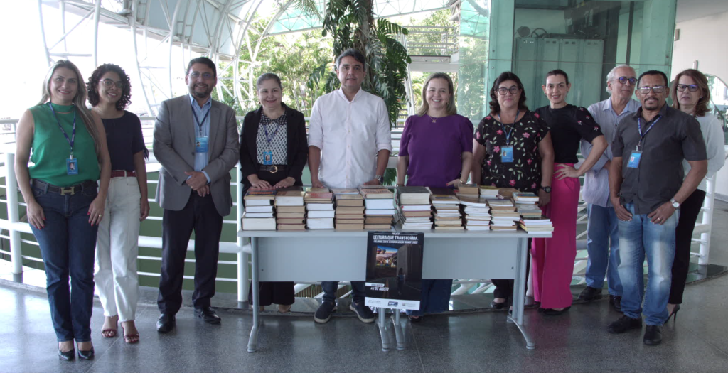 #Paratodosverem. Esta matéria possui recursos de texto alternativo para promover a inclusão das pessoas com deficiência visual. Primeira imagem: Dez servidores da Escola dos Servidores e gestor administrativo do Núcleo de Apoio ao GMF, Lusanil Cruz, posam para foto, lado a lado e sorrindo, em frente a uma mesa com dezenas de livros empilhados doados e com o cartaz da campanha Leitura Que Transforma. Eles estão no pátio da Escola dos Servidores. Segunda imagem: Diretora da Escola dos Servidores, Marluce Martins, em primeiro plano, em frente à mesa cheia de livros na Escola dos Servidores. Ela é uma senhora branca, de olhos castanhos escuros, cabelo preto preso para trás. Usa uma blusa preta e branca com estampa de flores, paletó preto, colar com pingente delicado e brinco dourado com pingente de pedra marrom redonda. Terceira imagem: Lusanil Cruz, do Núcleo de Apoio ao GMF, concede entrevista à TV.Jus em pé, em frente à mesa repleta de livros doados pela Escola dos Servidores. Ele é um senhor branco, de olhos castanhos escuros, cabelo liso, grisalho e curto, barba grisalha, usando camisa listrada branca e azul clara, paletó cinza e óculos de grau. Quarta imagem: Em primeiro plano, um livro é segurado aberto, em uma página cujo capítulo é “O Livro da Esperança”. Ao fundo, estão diversos outros livros empilhados sobre a mesa.