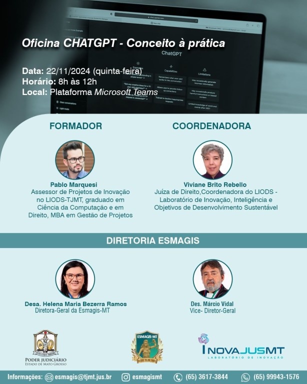 #ParaTodosVerem – Esta matéria possui recursos de texto alternativo para promover a inclusão das pessoas com deficiência visual. Imagem 1: banner colorido onde aparece, acima, informações textuais sobre o curso – Oficina ChatGPT – Conceito à Prática. Data (14/11/2024), horário (9h às 11h) e local (Plataforma Microsoft Teams). Abaixo, as fotografias do formador Pablo e da coordenadora Viviane. Ele é um homem branco, de cabelo e barba escuros, e óculos de grau. Ela é uma mulher branca, de cabelos grisalhos. Abaixo, a fotografia da diretora da Esmagis, desembargadora Helena Ramos, uma mulher branca, de cabelos escuros e óculos de grau. Já o vice-diretor, desembargador Márcio Vidal, é um homem branco, de cabelos escuros e barba grisalha. Assinam a peça os logos do Judiciário, Esmagis e InovaJusMT.