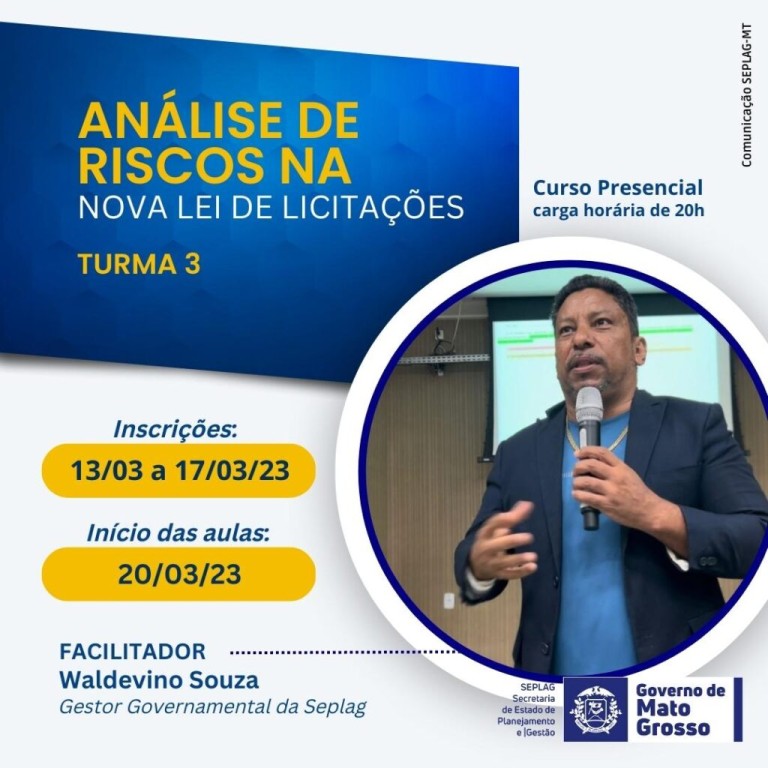 A Secretaria de Estado de Planejamento e Gestão (Seplag), por meio da Escola de Governo, está com as inscrições abertas para a terceira turma de 2023 do curso Análise de Riscos na Nova Lei de Licitações. Os interessados têm até o dia 17 de março para se inscrever. São ofertadas 60 vagas e as aulas terão início no dia 20 de março.