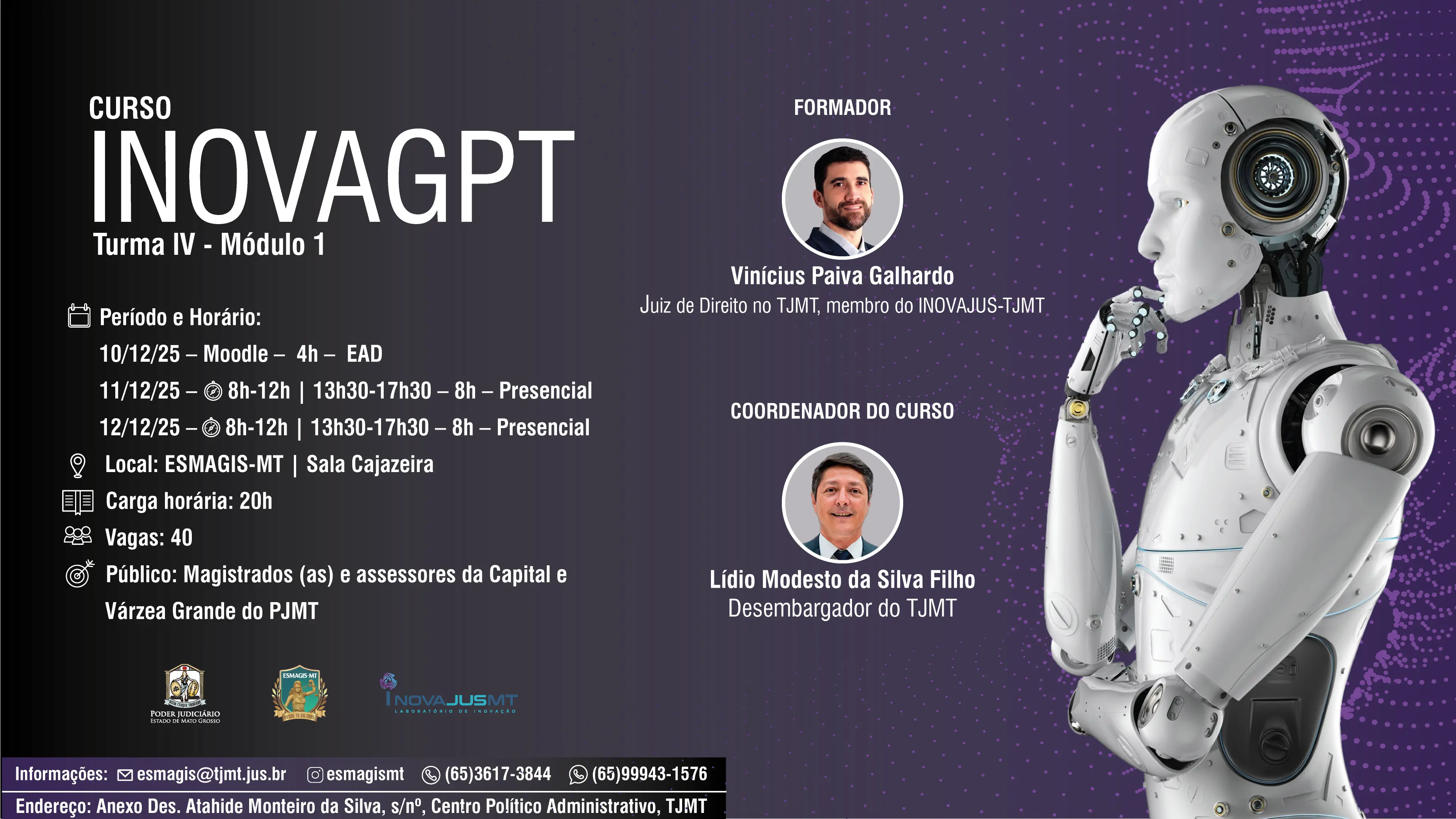 A Escola Superior da Magistratura de Mato Grosso (Esmagis-MT) oferta nesta semana, entre os dias 10 e 12 de dezembro, a quarta turma do curso “INOVAGPT: Transformando a Gestão Judicial com Inteligência Artificial” – Módulo 1. Aberta a magistrados(as) e assessores(as), a atividade pedagógica será realizada em formato híbrido para os alunos(as) já inscritos.