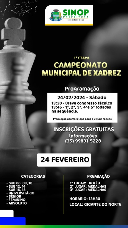 A primeira Etapa do Campeonato Municipal de Xadrez de Sinop já tem data marcada, o evento será realizado no dia 24 de fevereiro, no Estádio Gigante do Norte. Os interessados em se inscrever devem solicitar a ficha de inscrição no whatsapp da Gerência de Esportes, (66) 99998-3978. A participação é gratuita.