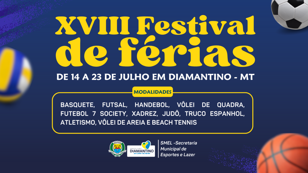 Julho é o mês das férias e da diversão, pensando nisso a Prefeitura de Diamantino, por meio da Secretaria Municipal de Esportes e Lazer, informa a abertura das inscrições para o XVIII Festival de Férias, que acontecerá entre os dias 14 a 23 de julho. Os jogos tem por objetivo promover competições esportivas individuais e coletivas para toda comunidade, priorizando o intercâmbio e a confraternização entre os atletas.