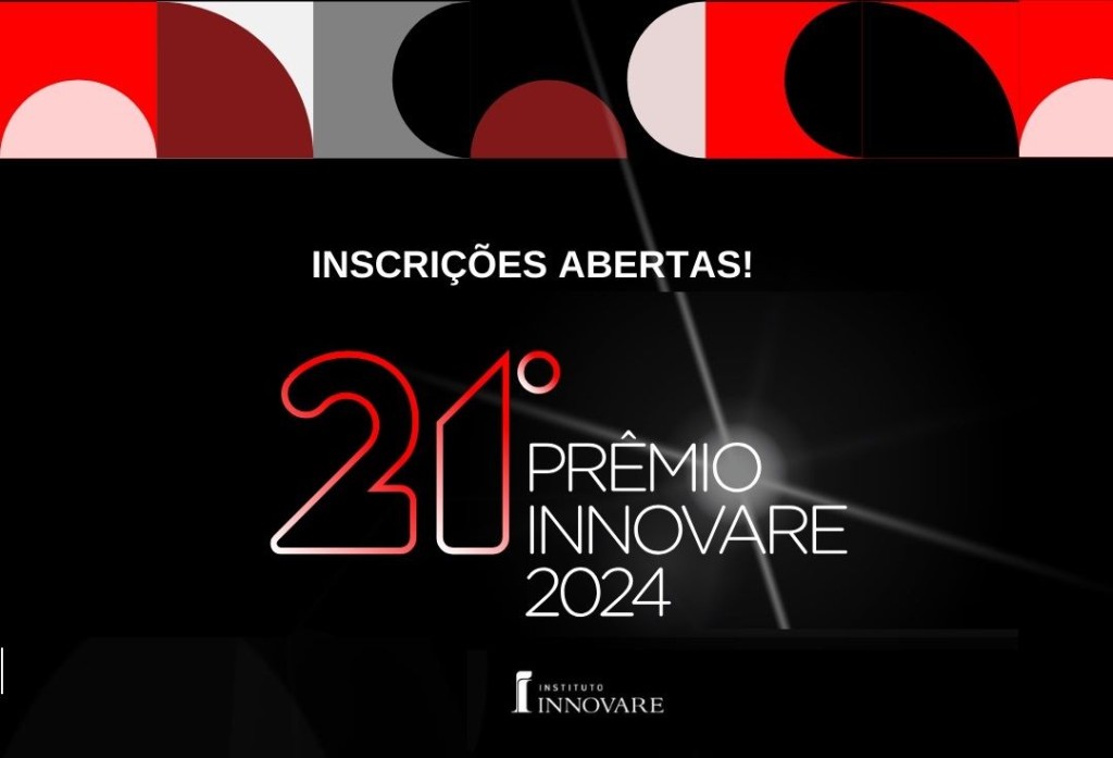 Descrição de imagem: arte gráfica digital com fundo preto, faixa superior em curvas nas cores preto, vermelho, vinho e rosa, ao centro, em letras bastão, estão escritos “21ª Prêmio Innovare”, com um brilho ao fundo, e “inscrições abertas”. Assina a peça o logo do Instituto Innovare.