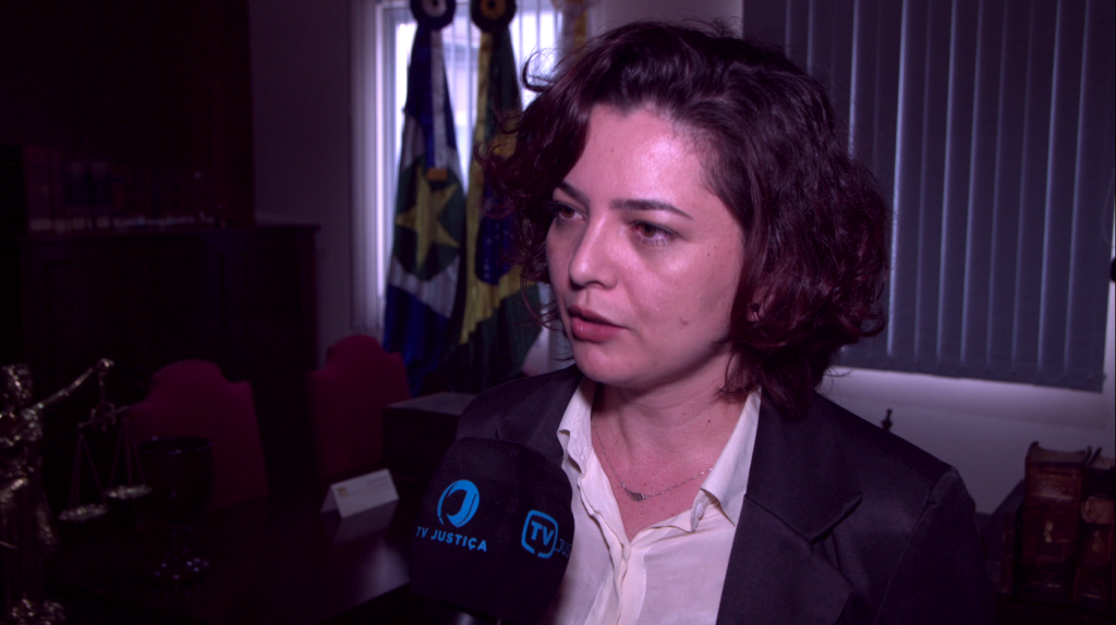 Esta matéria possui recursos de texto alternativo para promover a inclusão das pessoas com deficiência visual. Primeira imagem: Professora Laudiceia Fagundes concede entrevista à TV.Jus. Ela é uma mulher branca, de olhos castanhos, cabelo curto, ondulado e ruivo. Está usando camisa branca e paletó preto e um colar prateado delicado. Ao fundo, é possível ver na sala com as janelas fechadas por persianas uma mesa e um armário de madeira antigos cadeiras com encosto almofadado vermelho, uma escultura dourada da deusa Themis, livros no armário, além das bandeiras de Mato Grosso e do Brasil. Segunda imagem: Desembargadora Nilza Maria Pôssas de Carvalho concede entrevista à TV.Jus. Ela é uma senhora branca, com olhos castanhos claros, cabelo loiro, comprido e liso, solto. Usa uma blusa preta com um detalhe de uma faixa branca no colo. Ao fundo dela, é possível ver o Espaço Memória, uma sala com vários quadros na parede e documentos expostos. Terceira imagem: Estudante Thayla concede entrevista à TV.Jus. Ela é uma jovem negra de pele clara, com olhos castanhos escuros, cabelo preto e cacheado na altura do ombro. Ela usa uma camisa branca e preta com estampa geométrica, brincos e um colar com pingente de cristal. Ao fundo, é possível ver a dala do Espaço Memória. Quarta imagem: Professor Sérgio Melo concede entrevista à TV.Jus. Ele é um homem jovem, negro, careca, com barba preta e olhos castanhos escuros. Ele usa uma camisa azul, óculos de grau com armação preta e um brinco prateado.
