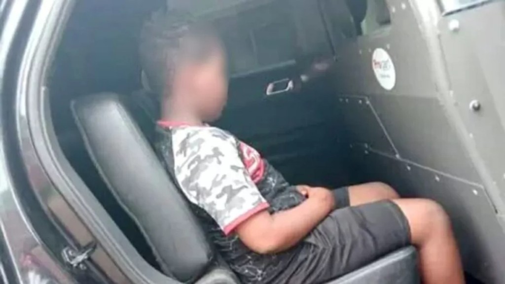 A criança estava fazendo xixi atrás do carro da mãe, quando foi flagrado pela polícia