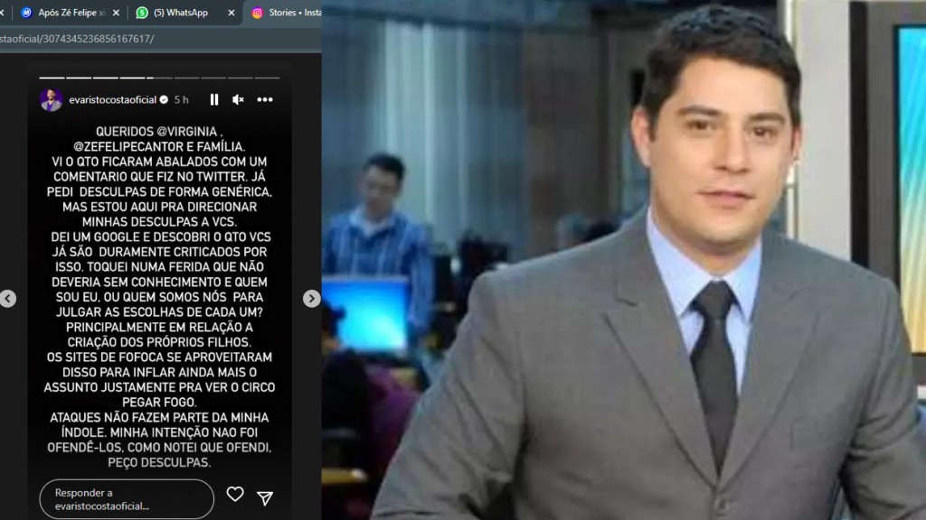 Após o cantor Zé Felipe xingar e confrontar Evaristo Costa por conta de um comentário envolvendo Virgínia Fonseca e a criação das filhas Maria Alice e Maria Flor, o jornalista usou as redes sociais para se desculpar com o casal.