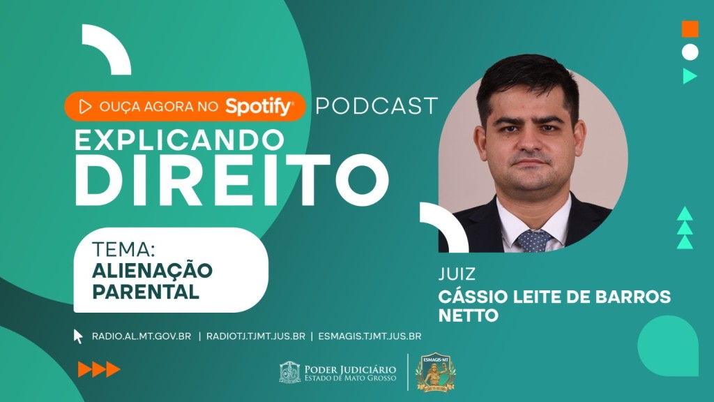 Esta matéria possui recursos de texto alternativo para promover a inclusão das pessoas com deficiência visual. Descrição: Fotografia retangular e colorida. Na lateral esquerda o texto ‘Ouça agora no Spotify!’. No canto superior direito a palavra Podcast. No centro, o nome do programa Explicando Direito, com a foto do convidado, o tema do programa –Alienação Parental – e o nome do convidado – juiz Cássio Leite de Barros Neto . Na parte inferior os endereços eletrônicos da Rádio Assembleia, Rádio TJ e Escola da Magistratura. Assina a peça o logo do Poder Judiciário de Mato Grosso e da Esmagis-MT.