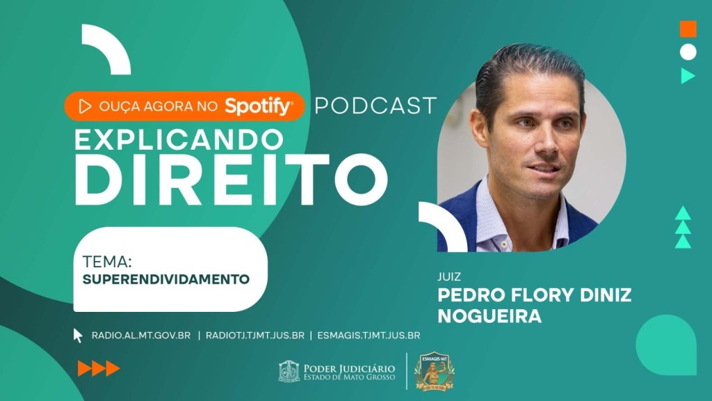 Esta matéria possui recursos de texto alternativo para promover a inclusão das pessoas com deficiência visual. Descrição: Fotografia retangular e colorida. Na lateral esquerda o texto ‘Ouça agora no Spotify!’. No canto superior direito a palavra Podcast. No centro, o nome do programa Explicando Direito, com a foto do convidado, o tema do programa – Lei do Superendividamento – e o nome do convidado – juiz Pedro Flori Diniz Nogueira. Na parte inferior os endereços eletrônicos da Rádio Assembleia, Rádio TJ e Escola da Magistratura. Assina a peça o logo do Poder Judiciário de Mato Grosso e da Esmagis-MT.