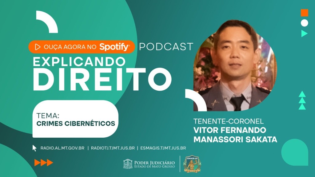 Esta matéria possui recursos de texto alternativo para promover a inclusão das pessoas com deficiência visual. Descrição: Fotografia retangular e colorida. Na lateral esquerda o texto ‘Ouça agora no Spotify!’. No canto superior direito a palavra Podcast. No centro, o nome do programa Explicando Direito, com a foto do convidado, o tema do programa –Crimes Cibernéticos– e o nome do convidado – Tenente-coronel Vitor Fernando Manassori Sakata, assessor militar do Tribunal de Justiça de Mato Grosso. Na parte inferior os endereços eletrônicos da Rádio Assembleia, Rádio TJ e Escola da Magistratura. Assina a peça o logo do Poder Judiciário de Mato Grosso e da Esmagis-MT.