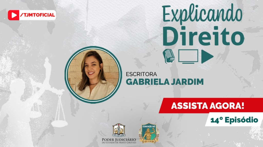 ParaTodosVerem: Essa matéria possui recursos de texto alternativo para promover a inclusão das pessoas com deficiência. Imagem retangular e colorida. Na lateral esquerda o ícone de play acompanhado do texto: /tjmtoficial. Na parte superior direita o logo do Programa Explicando Direito. Ao centro, a foto da convidada. Acompanha texto: Escritora Gabriela Jardim. Assista agora! 14º Episódio. Assina a peça a logo do Poder Judiciário de Mato Grosso.